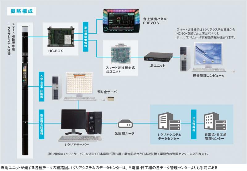 スマート遊技機を稼働させるために、絶対に必要な周辺設備の代表格は専用ユニットだ。従来の玉・メダル貸機と同様に、遊技球や遊技メダルを電子データとして貸し出すほか、スマパチ・スマスロから出力される各種信号をHC‐BOXに出力。遊技客には出玉情報を記録したICカードを排出する。