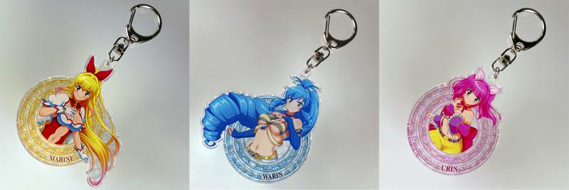 今回販売されるのは、アクリルクロック1種、マルチマット1種、アクリルキーホルダー3種。魔法少女の衣装を身に纏ったマリンちゃんたちのイラストが描かれている。