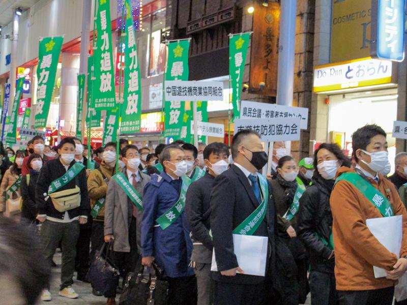 同大会は、暴力団追放活動を推進し、市民の暴力団排除意識の高揚を図るために行われるもの。山本基庚理事長を含む組合員49人が出席し、暴排の意識を高めた。大会後に行われたパレードには、遊技業界のほか県警や飲食業、建設業などの団体から約400人が参加。「暴力追放」のたすき、のぼりとともに、商店街約1キロを行進した。