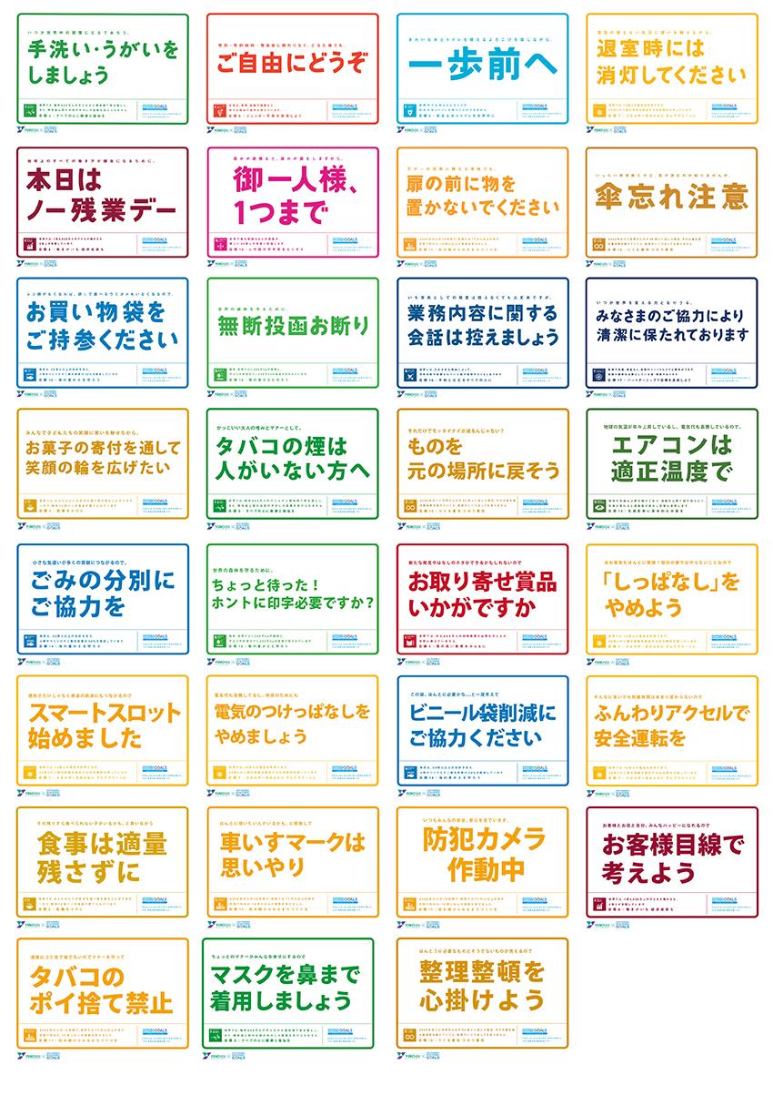 「ひとこと多い張り紙」は、特定非営利法人国際協力NGOセンター(JANIC)が展開している、無料ダウンロード可能なコンテンツ。SDGsが目指す17のゴールに関連する標語が記載されている。これに加え、同社は店舗で呼びかけたいフレーズをグループ内で募集し、オリジナルの張り紙も作成した。これらは各店舗の事務所やバックヤードに無期限で掲示される。