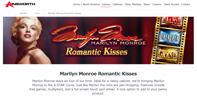ナツメアタリとして初めてのランドベースカジノ向けスロットマシン開発は6年前で、業界の大手スロットマシンメーカー、Ainsworth Game Technology(以下、Ainsworth)からこれまでに4機種がリリースされている。他のメーカーも含めると開発に携わったスロットマシンは25機種を超え、最新作はAinsworthの「マリリンモンロー(Marilyn Monroe Romantic Kisses & Lovely Hearts)」。同機は2021年10月にラスベガスで開催された展示会「G2E」でお披露目(※)され、GLIの承認を経て2022年10月に販売を開始。2022年末時点でネバダ州、カリフォルニア州のカジノに導入されている。※パチンコ・パチスロ機と異なり、カジノ業界では開発途中の実機を展示できる。