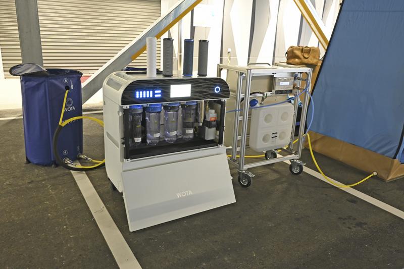 水の確保が最も重要との考えから、ペットボトル飲料のほか、空気中から水を作り出すことができるウォーターサーバー、6300リットルの水を飲める状態で約20年間保存可能な密閉型耐震性貯水槽を設置。2セットある屋外シャワーキットは、最先端のAI水処理技術によって使用した水の98%を再生利用可能な除菌・濾過装置を備えている。これにより気兼ねなくシャワーを使え、衛生状態を保つことができる。