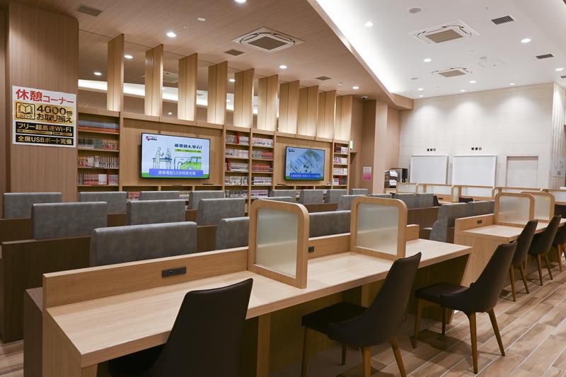 店内休憩コーナーの椅子1人用ソファシートは24台と非常に多い。これも災害時の利用を想定したもので、各席に充電用USB端子を備えている。
