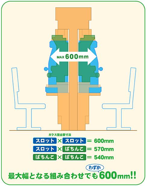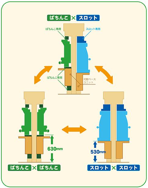 『EXCHANGEシステム』はパチンコとパチスロの切り替えの手軽さに特化した製品。『FLEXIBLEシステム』よりも少ない工程でパチンコとパチスロを切り替えられる。省スペースも特徴で、最大幅となる組み合わせでも600ミリメートルだ。
