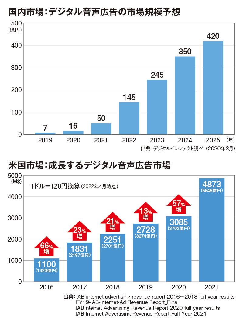 デジタル音声広告の配信対象は、Spotifyのような音楽ストリーミングサービスや、radiko(ラジコ)をはじめとするラジオアプリ。デジタル領域の調査会社・デジタルインファクトによると、国内でのデジタル音声広告の市場規模は2019年にはまだ7億円ほどだったが、21年には50億円にまで成長しており、25年には420億円にまで市場拡大が進むと予想されている。アメリカではより大きな市場が形成されており、ニューヨークに本部を置くネット広告業界団体・IABの調査では、21年には5848億円(22年4月段階、1ドル120円計算)の市場規模が存在する。