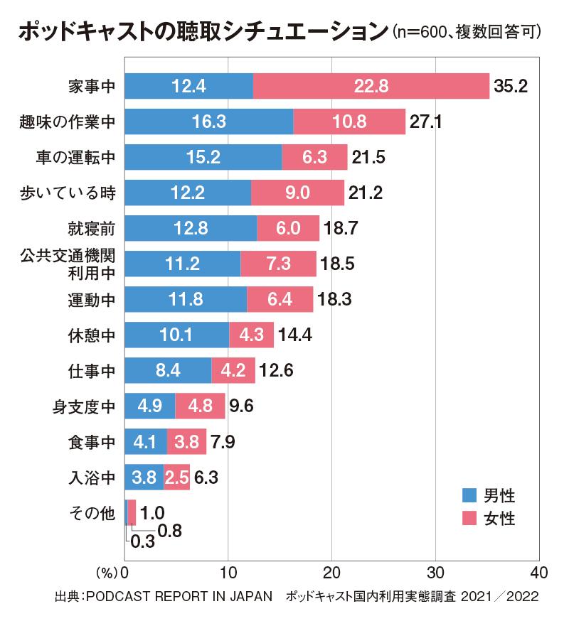デジタル音声広告を専門に扱う企業・オトナルと朝日新聞社が共同で行った「ポッドキャスト(インターネットでラジオ番組をはじめとする音声データを配信するサービス)国内利用実態調査2021」によると、ポッドキャストの聴取シチュエーションで最も多かったのは家事中で35.2%。趣味の作業中が27.1%、車の運転中が21.5%、歩いている時が21.2%と続き、音声メディアが「ながら聴取」されていることを裏付けている。これらの環境にいる消費者は動画広告やバナー広告などでは接触できない人たちだ。他の広告媒体ではアプローチしにくい生活者に訴求できるのも大きな強みだ。