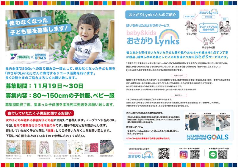 同社は11月19日に、SDGsに永続的に取り組むためのプロジェクト「YUKO SDGs Week」を開始。同プロジェクトでは子ども服寄贈のほかひとこと多い張り紙にも取り組んでいる。