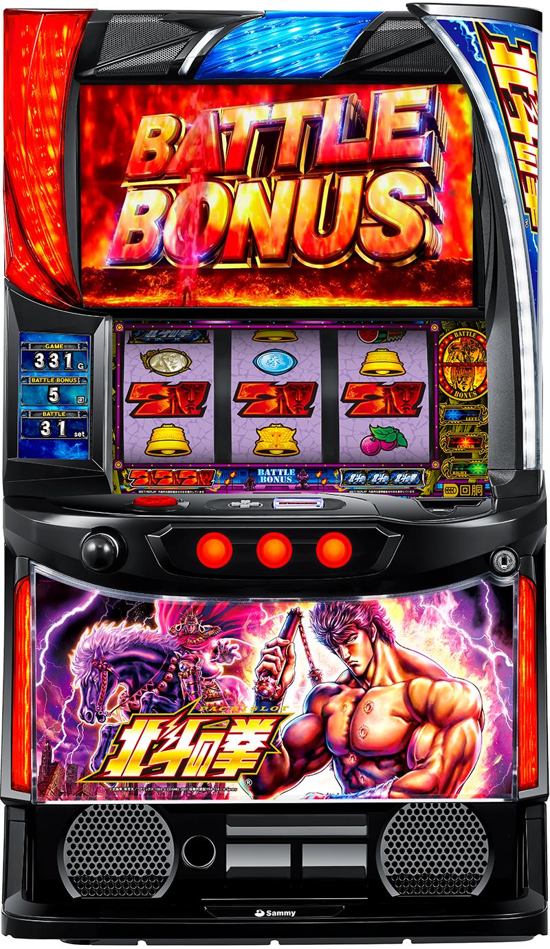 1セット約110枚のAT「BATTLE BONUS」は、ケンシロウがラオウに敗北するまで継続。基礎継続率66%、79%、84%、89%でループする。独自の有利区間システムを採用し、市場評価の高い「ツラヌキSPEC」を超えるATを楽しめる。バトル展開が有利になる「共闘」抽選や基礎継続率の格上げは自力次第だ。
