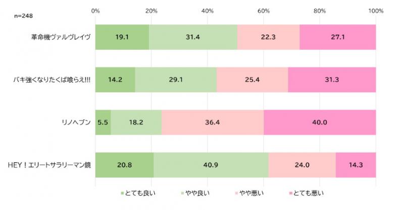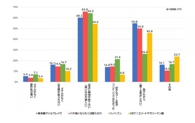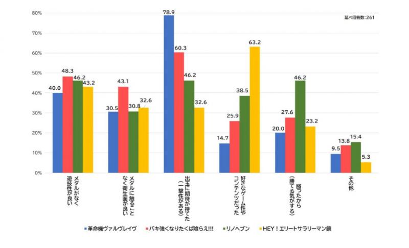 アンケート結果によると、それぞれの機種を良いと評価した理由は『パチスロ 革命機ヴァルヴレイヴ』『Lバキ 強くなりたくば喰らえ!!!』は「出玉に期待が持てた」が、『L HEY!エリートサラリーマン鏡』は「好きなゲーム性やコンテンツだった」が最も多かった。悪いと評価した理由は、すべての機種で「出玉に期待が持てない(吸い込みが激しい)」が最も多くなっていた。シーズリサーチは「機種によっては、一撃性に期待する一方で機種の荒さや連荘しないと獲得枚数が少ないなど厳しい展開も体感することになる。現状はAT機のみのリリースなので、負けた時にストレスを感じやすい」とコメント。「メダルがなくなったことで、出玉が出ていても遊技者側が確認しにくい環境になっていること」も原因だとし、対策が必要だとしている。