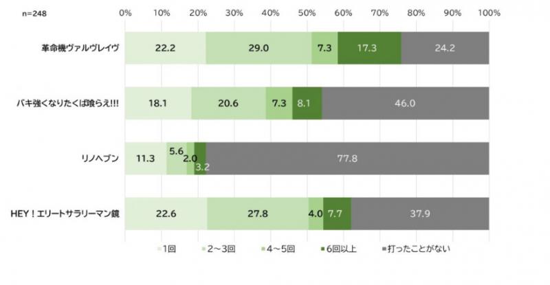 稼働中の4機種の遊技頻度についても調査。最も遊技された機種と最も評判の良い機種が異なっていた。4機種のうち最も打たれているのは『パチスロ 革命機ヴァルヴレイヴ』で76.8%、「6回以上遊技している」と回答した人の割合も4機種の中で最も多く、17.3%だった。しかし、4機種のうち参加者からの評判が最も良かったのは『L HEY!エリートサラリーマン鏡』で、良いと答えた人の割合(とても良い+やや良い)は61.7%、「とても悪い」と回答した人の割合も4機種中で最も低い14.3%だった。