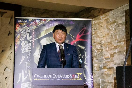 発表会の冒頭で、大泉秀治社長が挨拶。「初動・稼働貢献ともに5本の指に入るほど高かった前作・OVER‐SLOT『AINZ OOAL GOWN絶対支配者光臨』の正統後継機。昨今のAT機の最高水準に近い、スキのないスペックで適合できた。版権元はアニメが4シーズン放送された人気作品。演出も2D格闘ゲームのような映像表現に挑戦した。最強の版権と最高の映像表現、最高のゲーム性、最高のスペックに仕上がった。オーイズミの最高傑作と言っても過言ではない」と胸を張った。