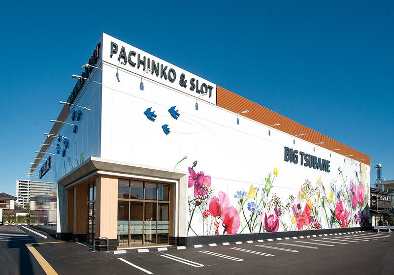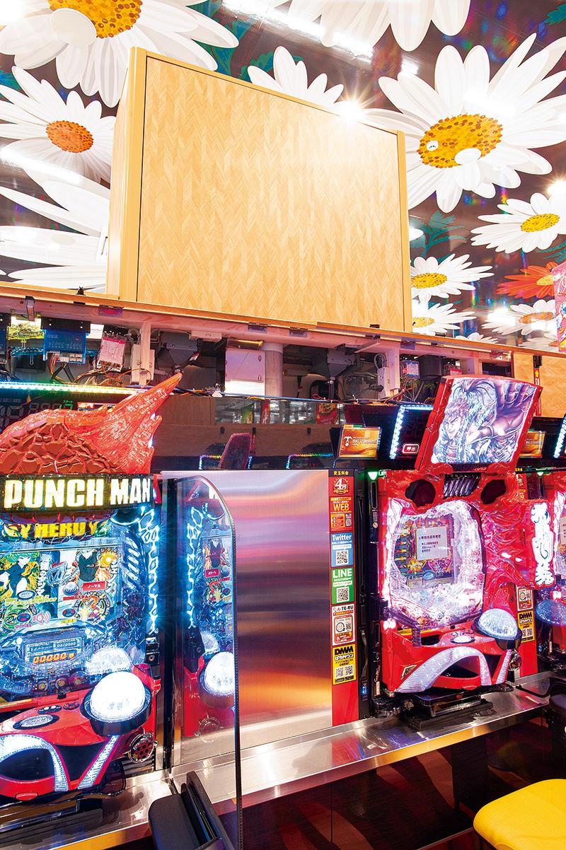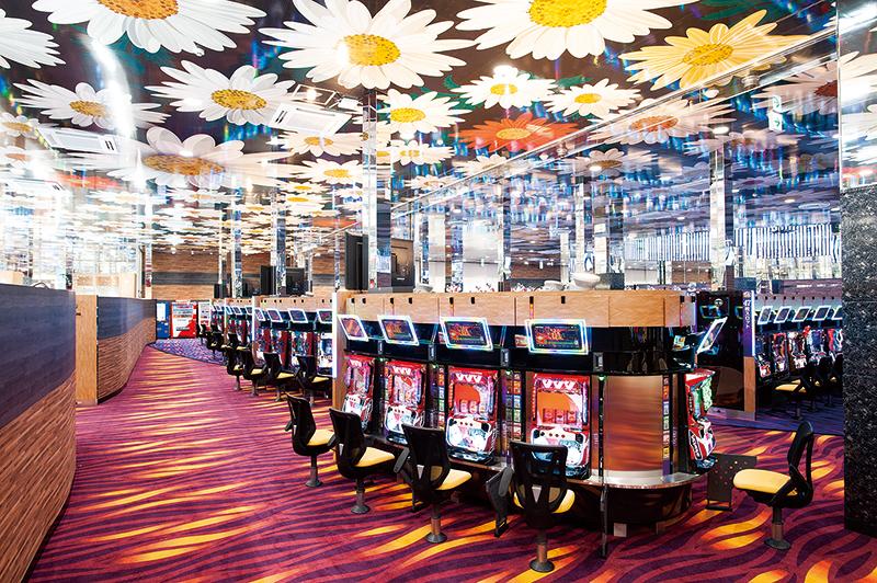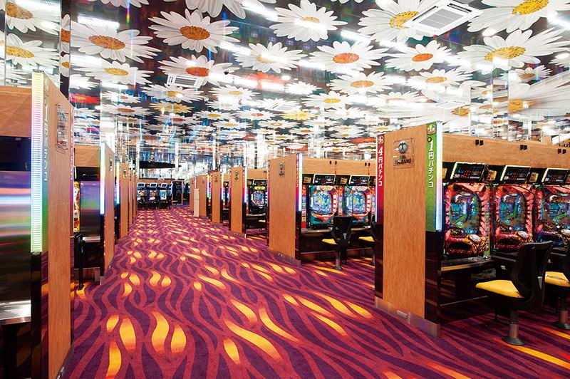 オオキ建築事務所が設計した店舗は、従来のパチンコホールのイメージを大きく変える花模様の外観にまず驚かされる。店内に足を踏み入れると天井にも花模様が描かれ、華やかな空間が広がる。