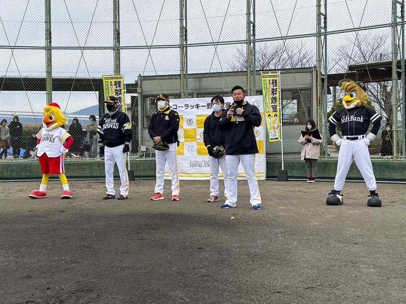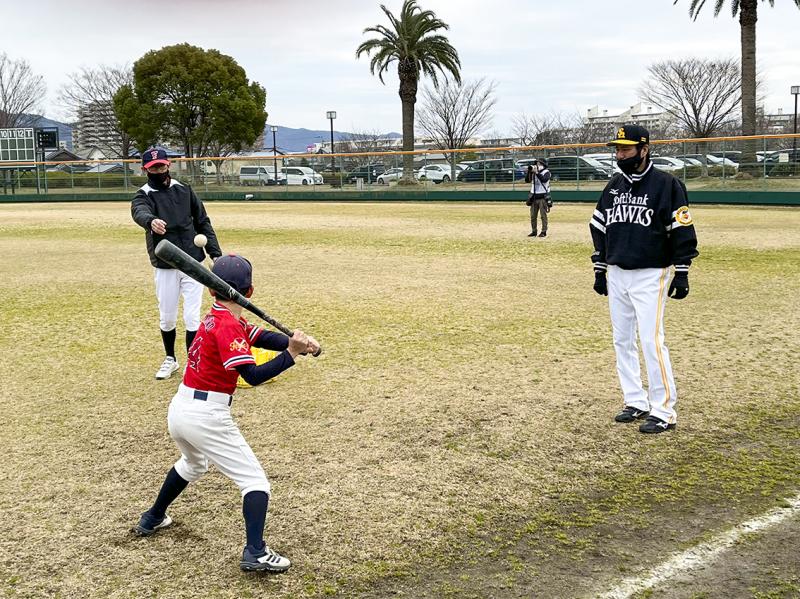 2023年02月16日No.10003298 ユーコーラッキーグループが学童野球教室に協賛 福岡県を中心にホール24店舗を展開するユーコーラッキーグループ(久留米市)は、福岡ソフトバンクホークス傘下のNPO法人ホークスジュニアアカデミーが主催する学童野球教室に協賛。2月11日に「ユーコーラッキー野球教室」が新宝満川野球場(同)で開催された。 当日は、地元の学童野球チーム8団体、計98人の児童が参加。4人の元プロ野球選手がコーチを務めて直接指導した。 同社は2020年から福岡ソフトバンクホークスのオフィシャルスポンサーを務めている。