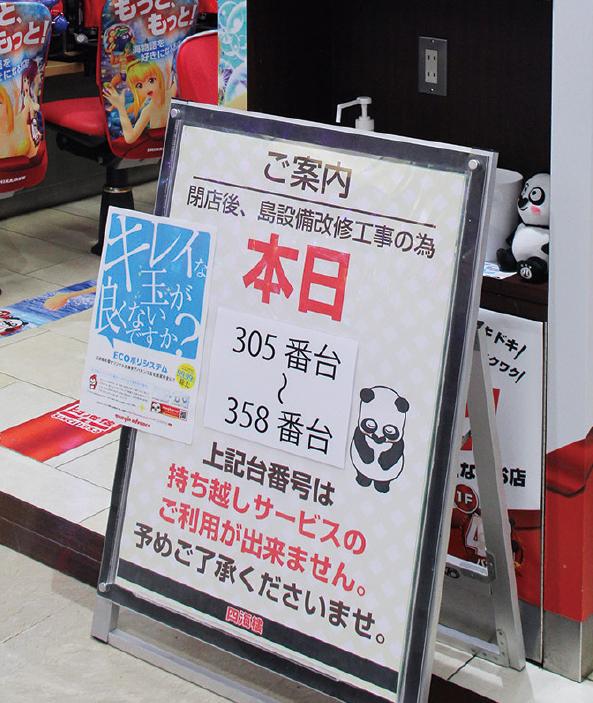 第一期工事中や工事が終了した直後は、改修の店内告知はしなかったが、ある常連客がスタッフに「なにかこの島変わった? 玉詰まりがなくなったようだし、玉もきれいだね」と声をかけた。スタッフが工事のことを説明すると、常連客は感謝の言葉を口にしたという。来店客が快適な遊技環境を体感できるようになったこと。これが『ECOポリシステム』差替え工事最大の成果だ。その後、より多くの来店客に快適に遊技できることを知ってもらおうとPOPを掲示している。