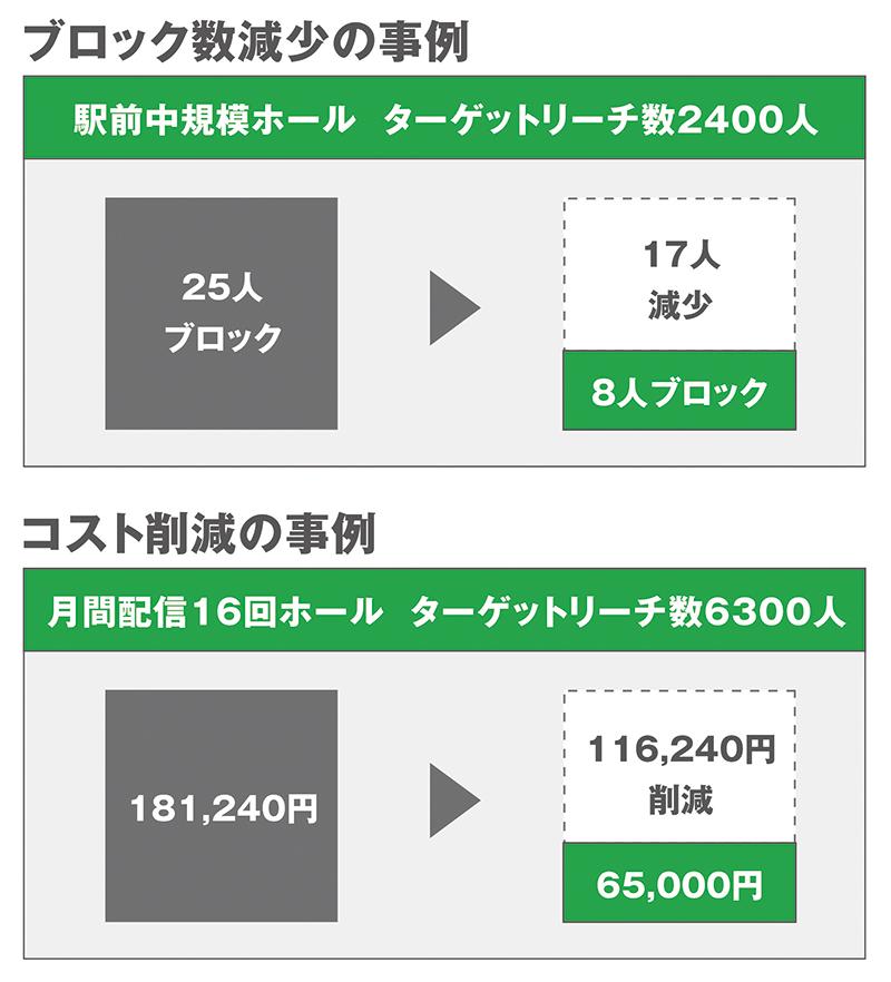 次に「ブロック率低下」の事例を見てみましょう。友だち数2400人、駅前500台規模のホールC(埼玉県)は、毎月25人のブロックが発生してしまっていました。そこでセグメント配信を活用し、「配信するターゲット」と「情報の内容」をミスマッチさせないように運用を行いました。その結果、毎月のブロックは8人となり、新規ブロックを17人減少させることに成功しました。
