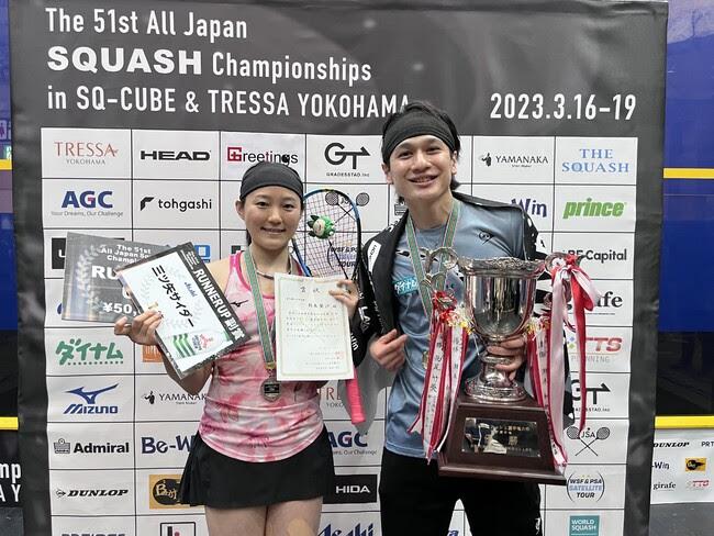 ダイナム所属の机龍之介選手と杉本梨沙選手は3月16日からの4日間、トレッサ横浜で開催(16日・17日の2日間は、エスキューブ横浜で開催)された「文部科学大臣杯争奪 第51回全日本スカッシュ選手権大会」に出場。机選手が2年連続、通算7度目の優勝。杉本選手が準優勝した。