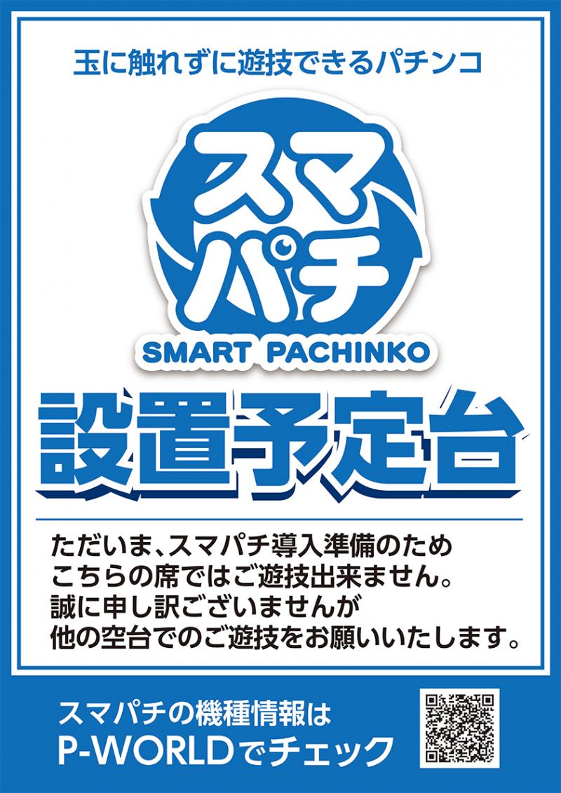 このポスターは、スマパチ導入前に専用ユニットを店頭設置する場合を想定してデザインされたもの。「スマパチ設置予定台」などの文言が記載されている。スマパチ設置を控えた稼働停止席などに掲示すれば、現在遊技できない旨を伝えつつ、スマパチ導入をアピールし、ファンの期待感を高められる。素材データは、P-WORLDメンテナンスページ内のホール向け画像素材集(印刷用素材集)から無料ダウンロードが可能だ。