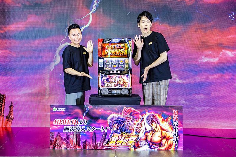 サミーは3月31日から、新機種『スマスロ北斗の拳』のCMを放映する。東京・大崎の本社ビルで30日、CMに起用したお笑い芸人のかまいたちを招いて発表会を開催した。