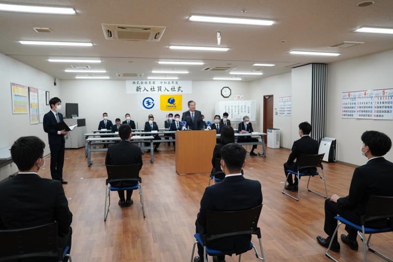 入社式で一人ひとりに辞令を手渡した山喜多映一社長は、「皆さんは創業70周年という大きな節目の年の新入社員です。当社は従業員にやりがいと幸せを提供します。皆さんはお世話になった親や家族を支えられる立派な人間に成長してください。先輩や仲間が積極的にサポートしますので、一緒に玉屋を盛り上げていきましょう」と祝辞を述べた。