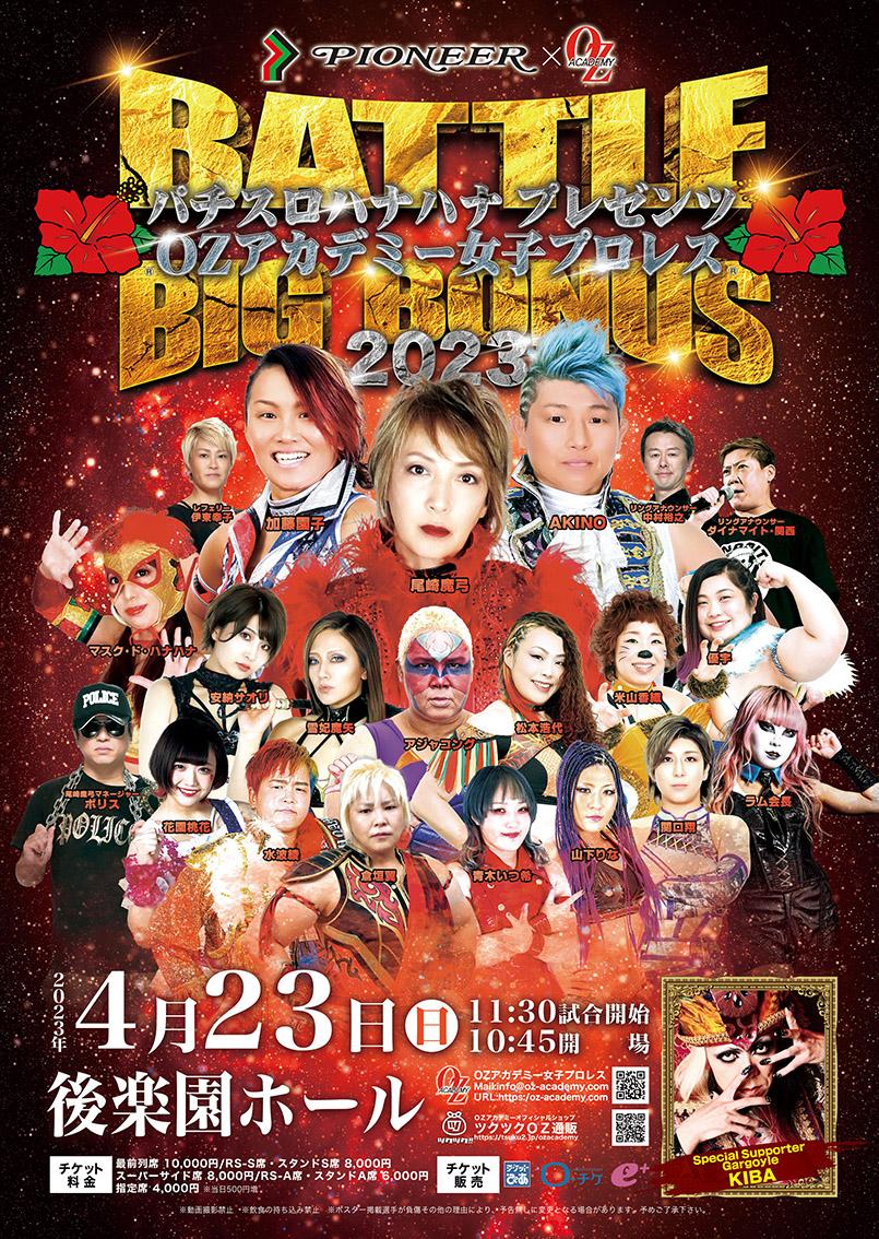 パイオニアは、昨年に続き2023年度も「OZアカデミー女子プロレス」に対する活動支援や協賛を行う。「パチスロハナハナプレゼンツ」を冠した興業試合である『BATTLE BIG BONUS』を4月23日の東京・後楽園ホールを皮切りに、名古屋、福岡、沖縄の4カ所で開催する。