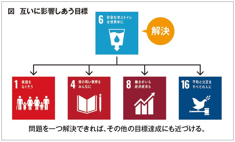目標6が解決できることで、目標1・4・8、そして目標16にもポジティブなアプローチを生み出すことも可能となります(図)。