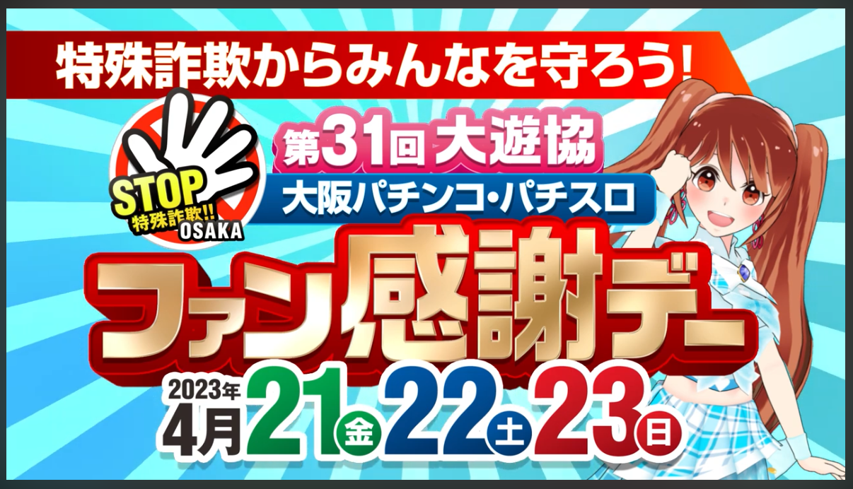 大阪府遊技業協同組合は4月13日、「第31回大遊協 大阪パチンコ・パチスロファン感謝デー」を開催すると発表した。開催期間は4月21日から23日までの3日間。