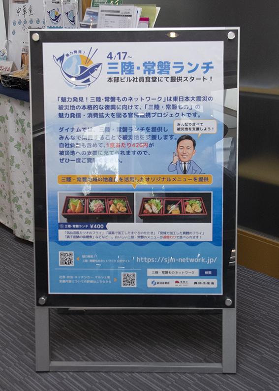 ダイナムは4月17日から東日本大震災の復興支援の一環として、都内本社ビルの社員食堂で三陸・常磐産の食材を使用したランチの提供を社員向けに開始した。
