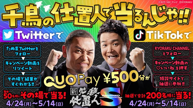 4月24日から5月14日までの期間にTwitterとTikTokで実施。Twitterでは、公式Twitterアカウントをフォローし、当該ツイートをリツイートすることで参加可能。毎日50人(計1050人)にQUOカードpay500円分がプレゼントされる。TikTokでは、まず公式TikTokアカウントをフォローし、お笑いコンビ・千鳥が登場するキャンペーン動画の「いいね」ボタンを押す。そして特設サイトに移動し、「抽選を回す」ボタンを押せば参加完了、抽選で200人にQUOカードpay500円分がプレゼントされる。TwitterとTikTokのいずれも、抽選結果はその場で判明する。