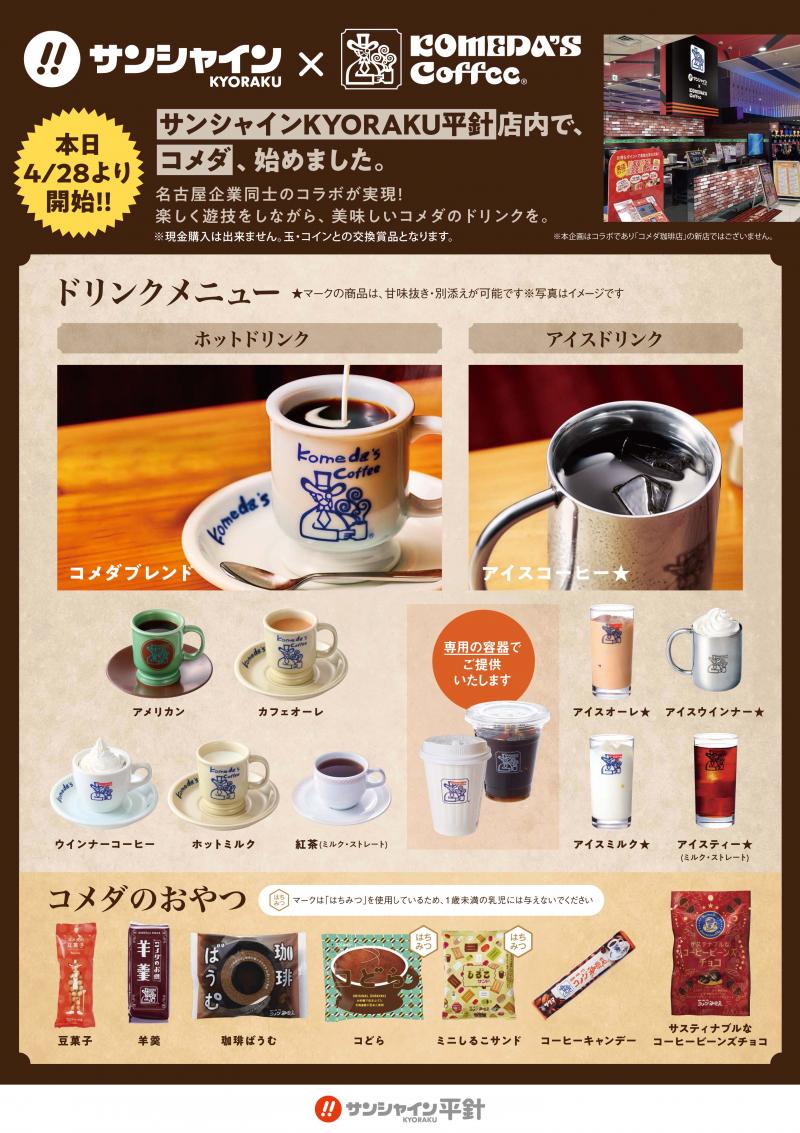 愛知県内でKYORAKUの直営店「サンシャインKYORAKU」を4店舗展開する京楽は、4月28日から『サンシャインKYORAKU平針』(名古屋市)で、950店舗を全国展開しているカフェチェーン「コメダ珈琲店」のメニューをワゴンサービスで提供する。