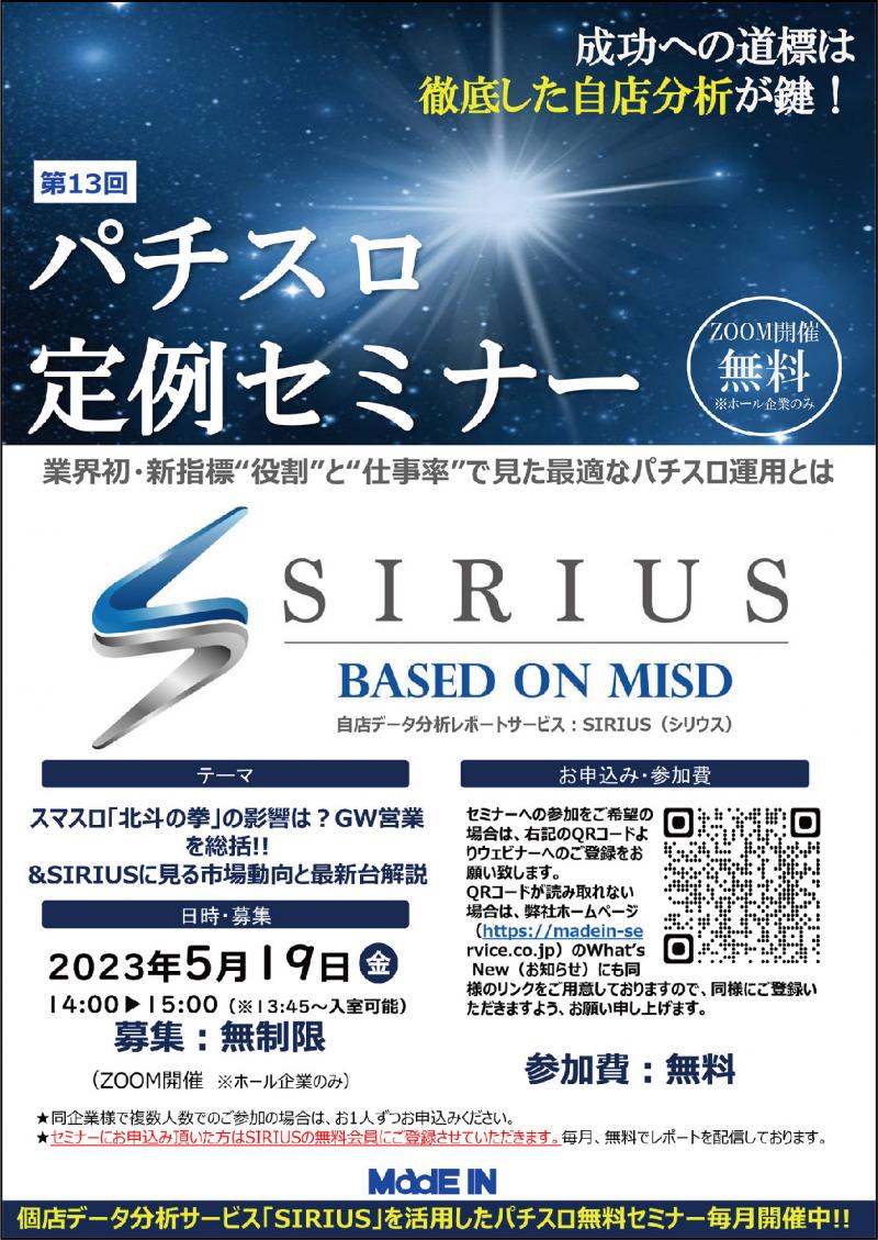 このセミナーでは毎回、個店ごとの戦略構築を支援する同社の自店データ分析・レポートサービス「SIRIUS」(シリウス)のデータをもとに市場動向を分析。新台の解説や運用のポイントを伝えている。