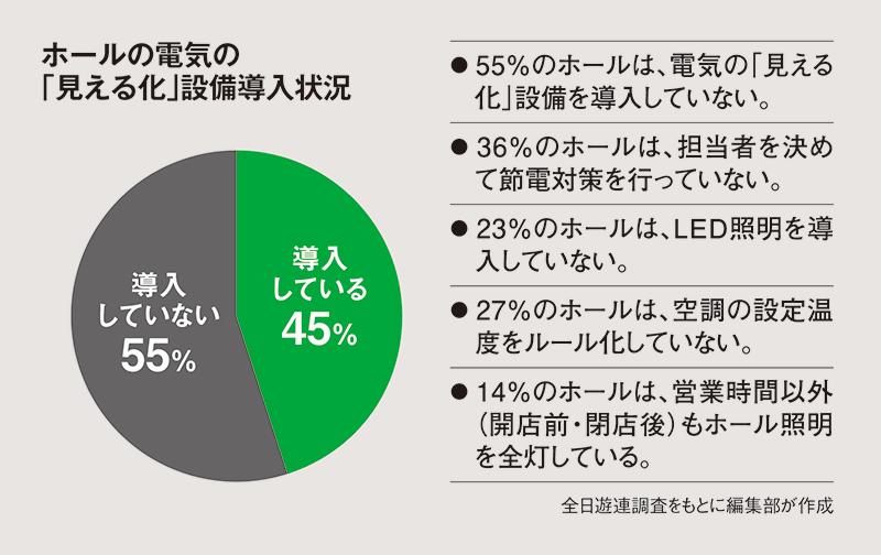 業界の中でベンチマークとされるような大手法人、地域有力チェーンは過去10年の間に店舗照明をLED化し、空調効率の高い設備に交換を終えている。しかし、この全日遊連が行った調査におけるホールの施策に関する回答からは、やや意外な状況が見えてくる。結果の要点は図の通りだ。これが、多くのホールはまだ使用電力量を減らす余地があるはず、という根拠だ。