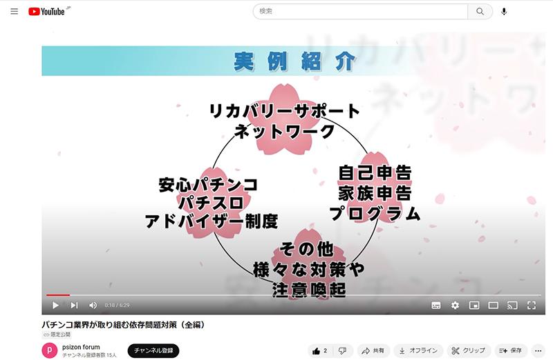 約6分半にわたる動画では、パチンコやパチスロの遊び方に不安を覚えた本人やその家族らから電話相談を受け付ける「リカバリーサポート・ネットワーク」や、「自己申告・家族申告プログラム」、「安心パチンコ・パチスロアドバイザー制度」などが紹介され、遊技業界がパチンコ・パチスロ依存問題のリスク最小化に務めていることを伝えている。