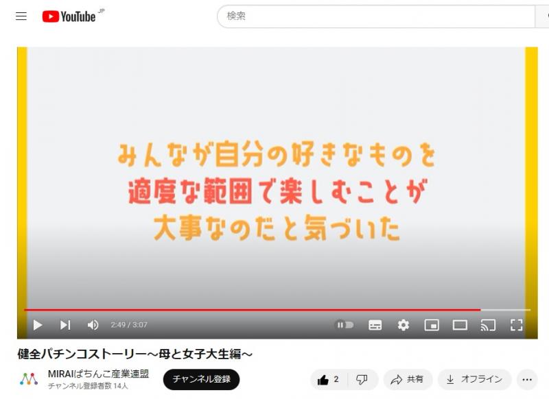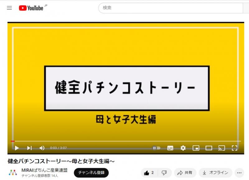 MIRAIぱちんこ産業連盟も5月16日、啓発動画「健全パチンコストーリー~母と女子大生編~」をYouTubeで公開した。