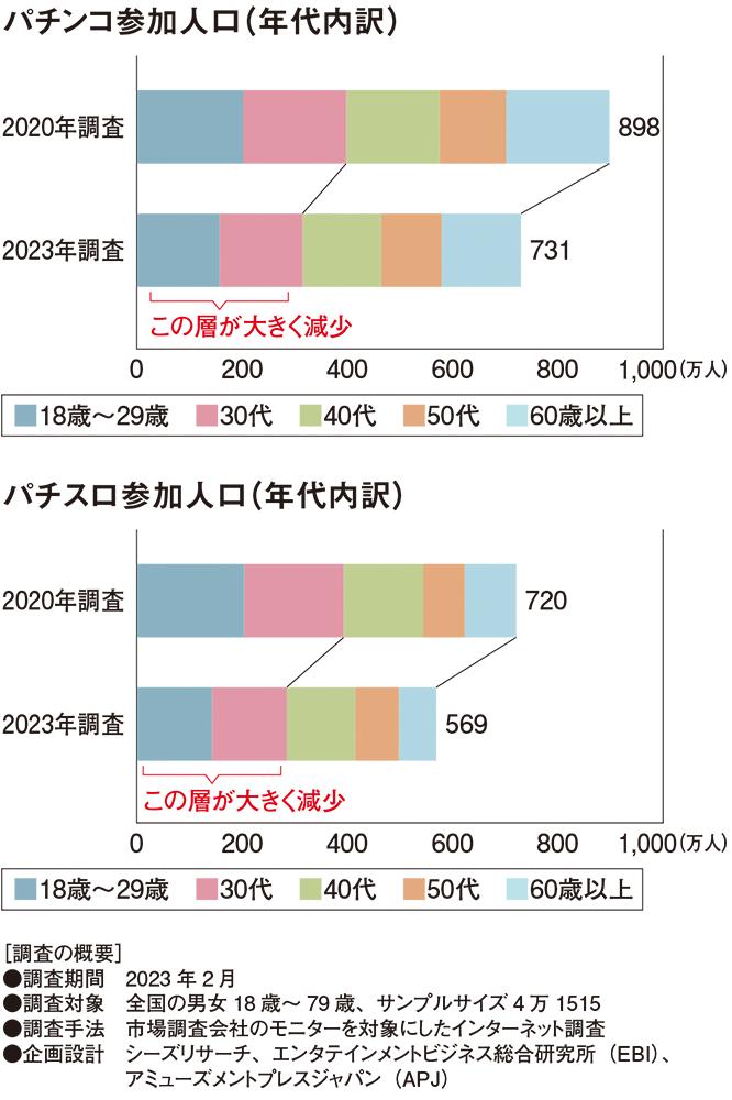 遊技参加者率は、2021年の活動を尋ねた前年調査(2022年2月に実施)より0.2ポイント(推計24万人)減少した。コロナ禍前の2019年の遊技参加者率は10.6%で参加人口は推計1024万人だったので、3年間で2割近く(推計215万人)も遊技参加人口が減ったことになる。