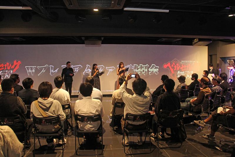 プレミアムファン試打会のゲストは、シーサ。さん(アロウズスクリーン)、倖田柚希さん(DMM ぱちタウン)、フェアリンさん(パチマガスロマガ)の3人。参加者を3回に分け、計約100人が一般導入前の最新台の試打やミニゲーム、ゲストのトークなどを楽しんだ。