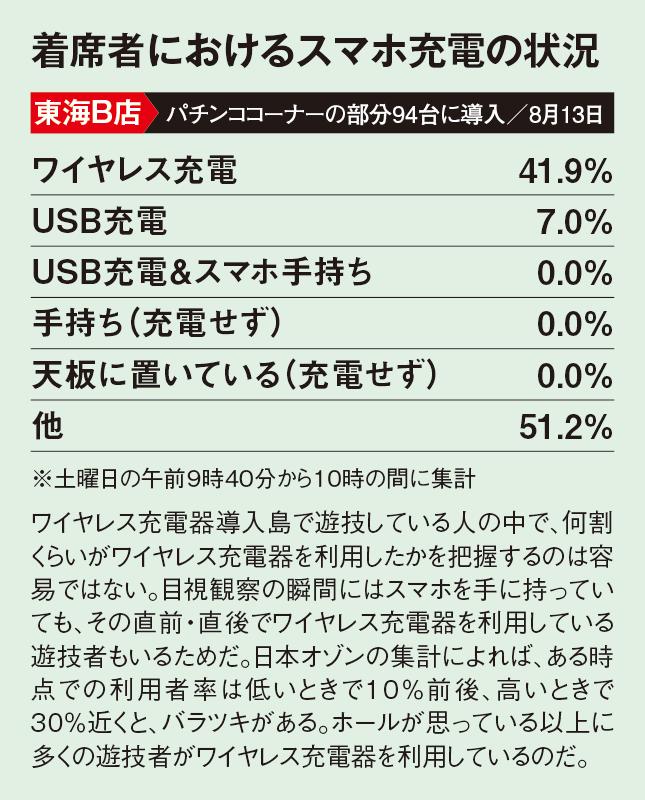 実際、少し時間をかけて観察すると、ワイヤレス充電器設置コーナーにおける利用者率は非常に高い。東海地方のあるホールでは、パチンココーナーの94台に設置しており、着席者における利用者率は4割を超えている(表を参照)。