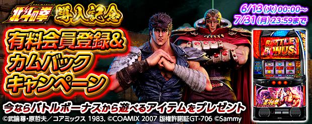 配信を記念して「スマスロ北斗の拳導入記念!有料会員登録&カムバックキャンペーン」も実施。6月13日から7月31日までの間に有料会員登録することで、ゲーム内アイテムをゲットできる。