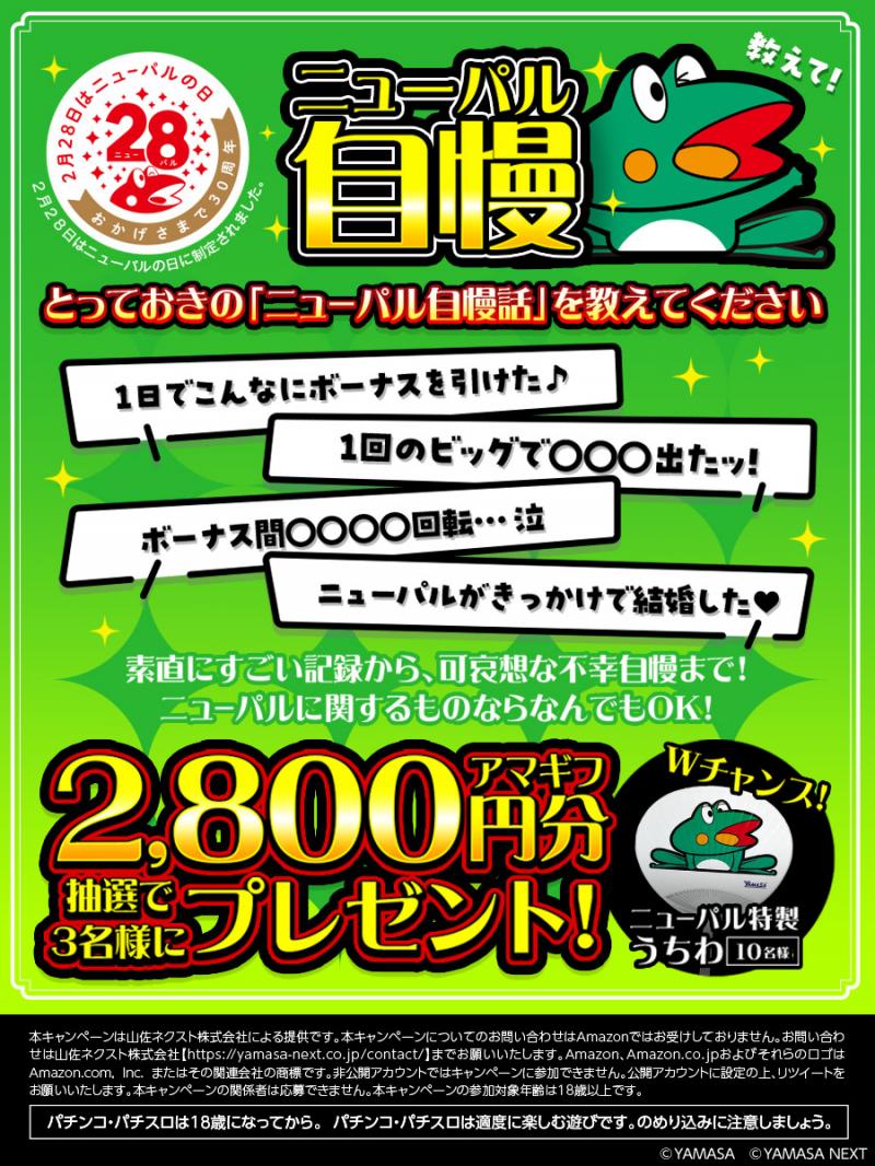 今回のキャンペーンでは、「ニューパル自慢話」を募集。山佐グループ公式Twitterをフォローし、当該ツイートを引用しながら「ニューパル自慢話」を投稿することで参加完了。抽選で3人にAmazonギフト券2800円分が当たる。「ニューパル特製うちわ」が10人に当たるWチャンスも用意されている。