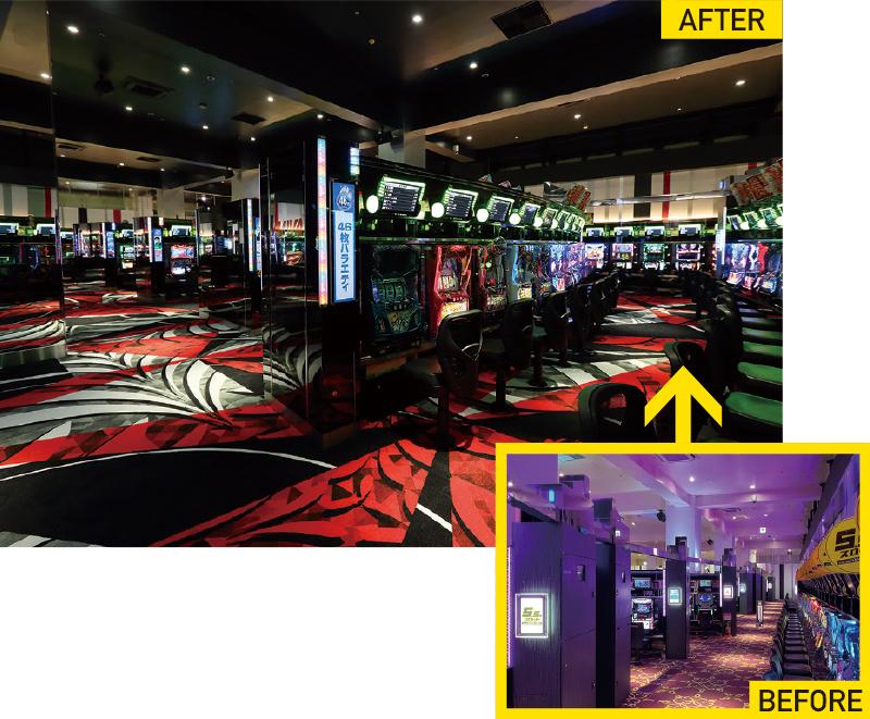「最近多いご相談のひとつがスマート遊技機導入を機にしたリニューアルで、『BIGディッパー新橋1号店』様のパチスロフロアのように、従来は遊技機を設置できなかった段差がある場所を有効活用して設置台数を増やすご提案が可能です。業界の状況を反映したもうひとつ増えている引き合いが、業態転換や新規事業でのデザイン相談です」(設計・デザイン部の結城敦さん)