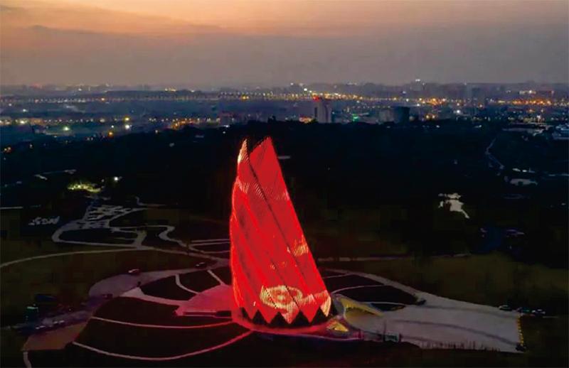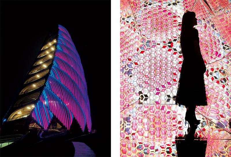 写真は、アコードデザインが業務提携しているLED照明メーカーやプログラミング会社が、アジア諸国や欧米など世界を舞台に手がけた作品だ。いずれも、想像を超える大規模なスケール感と完成度の高さに驚かされる。