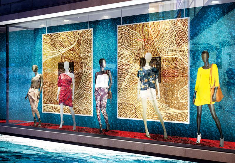 アルク.デザインは、カーペットだけでなく、空間のトータルデザインも得意としている。事例①は、銀座の有名ブティックのショーウインドウのトータルデザインを手がけたもの。空間構成や色使いだけでなく、グラフィックシートの選び方にも感性の良さが感じられる。事例②は「和」をモチーフにした飲食店。壁面2カ所とカーペットはそれぞれ異なったテイストにも関わらず、個性がぶつからず全体的に調和のとれた空間づくりに成功している。