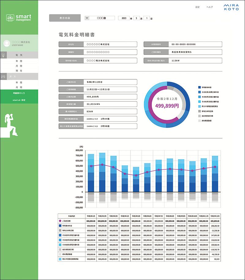 このポスターに掲げられている年間電力使用量などの数字を、以前は電力会社の電力使用量明細書を手入力して集計していたが、たいへんな手間だった。未来のコトは、最近AI OCRを独自開発。スキャンデータやスマホの撮影画像さえあれば、極めて高い精度で瞬時にテキスト化し、エクセルなどにエクスポートできるようになった。帳票やグラフ化もできるため、系列店別や月別の節電効果を一覧することも可能で(右下の画像)、節電施策の改善にも役に立つ。こうしたシステムを利用できるのも、『スマートエアーシリーズ』導入のメリットのひとつだ。