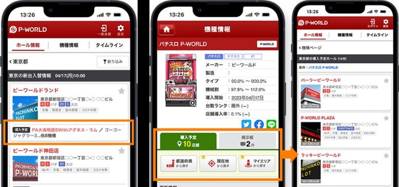ピーワールドでは「ホール様は直近の新台入替情報だけではなく、次々回以降の導入機種も同時に告知できるようになるなど、新台に期待するユーザー様への訴求効果を高めた仕様となっています」としている。