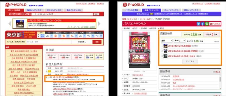 都道府県別の新台入替情報ページでは、店舗ごとに登録した機種を表示。個別機種ページでは、その機種の導入予定店舗が検索でき、検索結果のページに導入予定ホールの一覧が表示される。