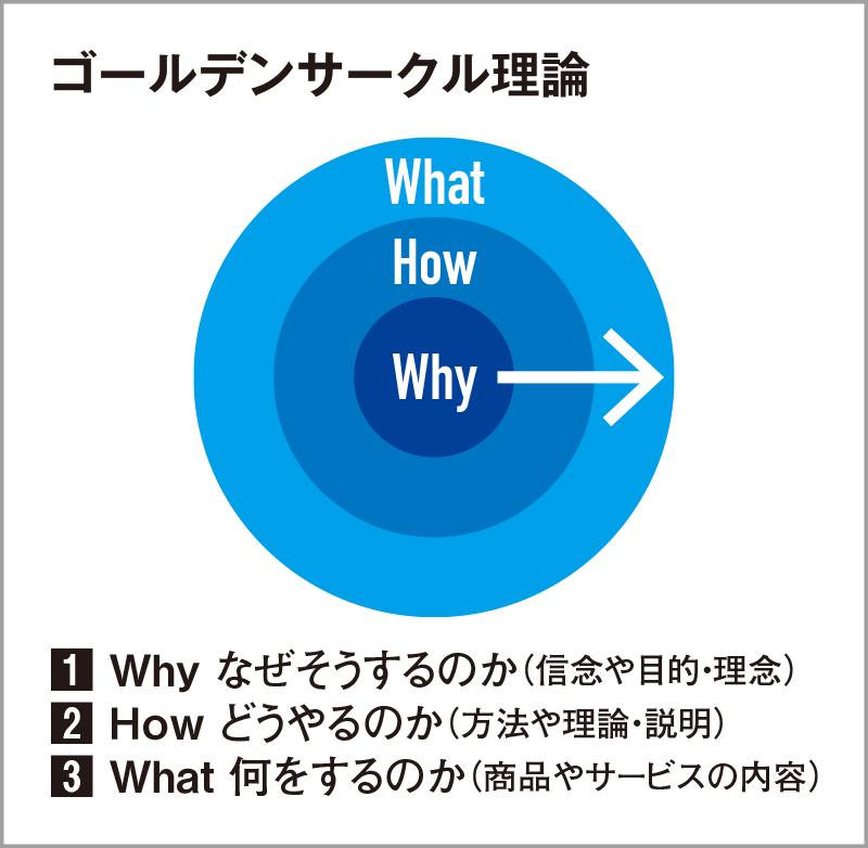 人の心を動かすには外(What)から内(Why・How)ではなく、内(Why)から伝えることが重要という考え方がゴールデンサークル理論です。