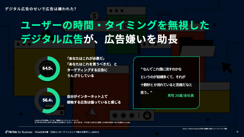 生活者のデジタル広告への嫌悪感が表面化していることが、様々な調査レポートによって報告されている。白書ではその理由を、「デジタル広告は発信者側の都合を優先し、ユーザーの時間やタイミングを無視してしまったため、広告嫌いを助長している」と分析(下図を参照)。