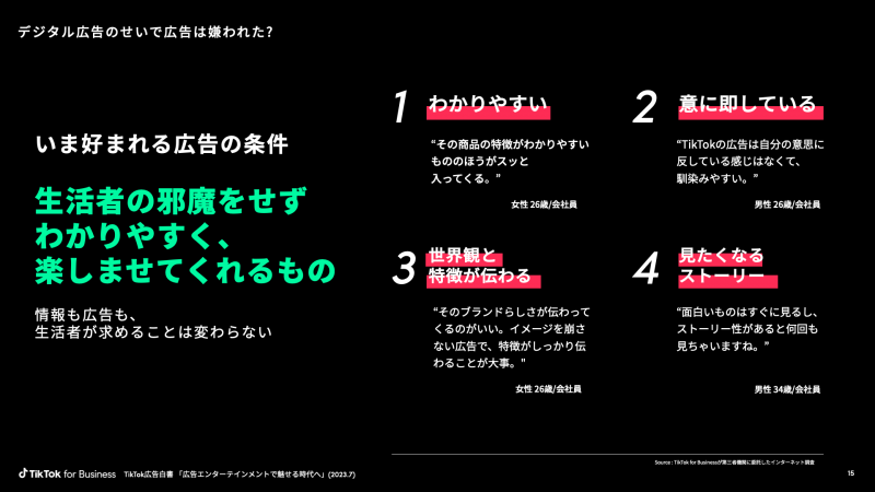 しかし同社は「すべての広告が本質的に嫌われているわけではない」とも述べている。回答者の声をもとに、「時間やタイミングを邪魔せず、商品やサービスの特徴を分かりやすく伝え、楽しませてくれる広告は好まれる傾向にある」と指摘。広告配信時には生活者の時間を尊重したうえで、「自分たちが何者であるか」「どんな利益をもたらすのか」をエンターテインメント性を持たせつつ、分かりやすく伝えることが重要だと提言している。