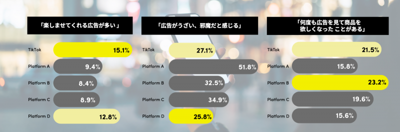 広告に対する認識も、各プラットフォームによって異なる。白書によるとTikTok広告は「楽しませてくれる広告が多い」と回答した割合が他のプラットフォームよりも高く、15.1%。この調査結果から同社は「TikTok広告はエンターテインメント性のあるものとしてユーザーに認識されている」と説明した。