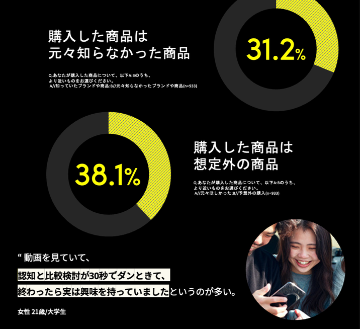 重ねて、「生活者の情報接触や情報ニーズが変化していることで、消費プロセスにも変化が起きている」と言及。調査の結果31.2%が「購入した商品は元々知らなかった商品である」、38.1%が「購入した商品は想定外の商品である」と回答。消費プロセスは予測しづらいものへと変化している。