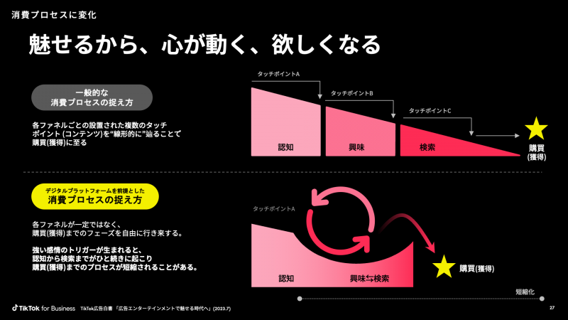 従来の一般的な消費プロセスは、「認知」「興味」「検索」という各ファネルを直線的に辿って「購買(獲得/DL)」に至る。しかしデジタルプラットフォームを前提とした新しい消費プロセスでは、「購買(獲得/DL)」までのフェーズを自由に移動するとしている。そこに強い感情のトリガーが生まれると認知から検索までがひと続きに起こり、購買(獲得/DL)までのプロセスが短縮されることもあると解説した。